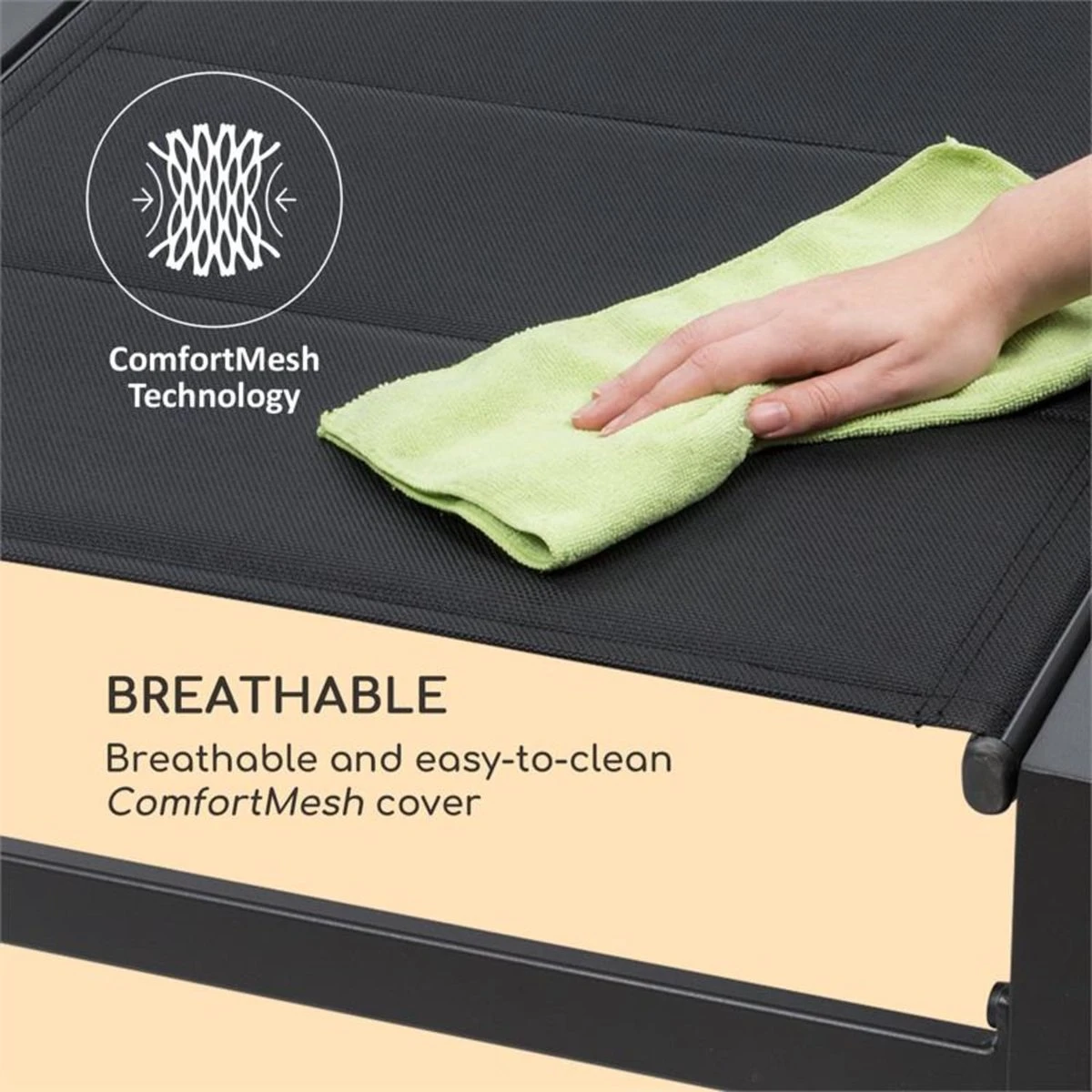 Welkom op het zonnedek! Weg uit de dagelijkse sleur, doe de zwembroek of bikini aan en hup, op de Blumfeldt Renazzo Lounge ligstoel om te zonnen, om behaaglijk de zomer te genieten – in de tuin, op het terras, het balkon en natuurlijk aan het zwembad.Met de Blumfeldt Renazzo Lounge tuinligstoel wordt dit jaar heel comfortabel zon getankt. Dankzij de 1,3 cm dikke ComfortMesh bekleding van polyester en pvc rust u op de 186 cm lange en 56 cm brede zit- of ligstoel als u zich op de wolken bevindt. Met 6 hoogtestanden kiest u volkomen vrij of u liever wilt zitten of liggen. Voor het dutje in de frisse lucht kan de ligstoel zelfs compleet vlak worden neergezet. Het kleurechte roosterweefsel is ademend, weerbestendig en droogt bijzonder snel. Zo staat de ligstoel altijd klaar om te gaan zonnebaden. Bij alle luxe om eens heerlijk de boel de boel te laten komt ook de lange gebruiksduur niet te kort: het vederlichte frame is uiterst stabiel van aluminiumbuizen vervaardigd zodat de gehele ligstoel slechts 8 kg weegt. De poederlak op de metalen delen zorgt voor extra weerbestendigheid en laat zich gemakkelijk reinigen. Zoek de zon op en ontspan! Met de Blumfeldt Renazzo Lounge ligstoel relaxt u de hele zomer lang.