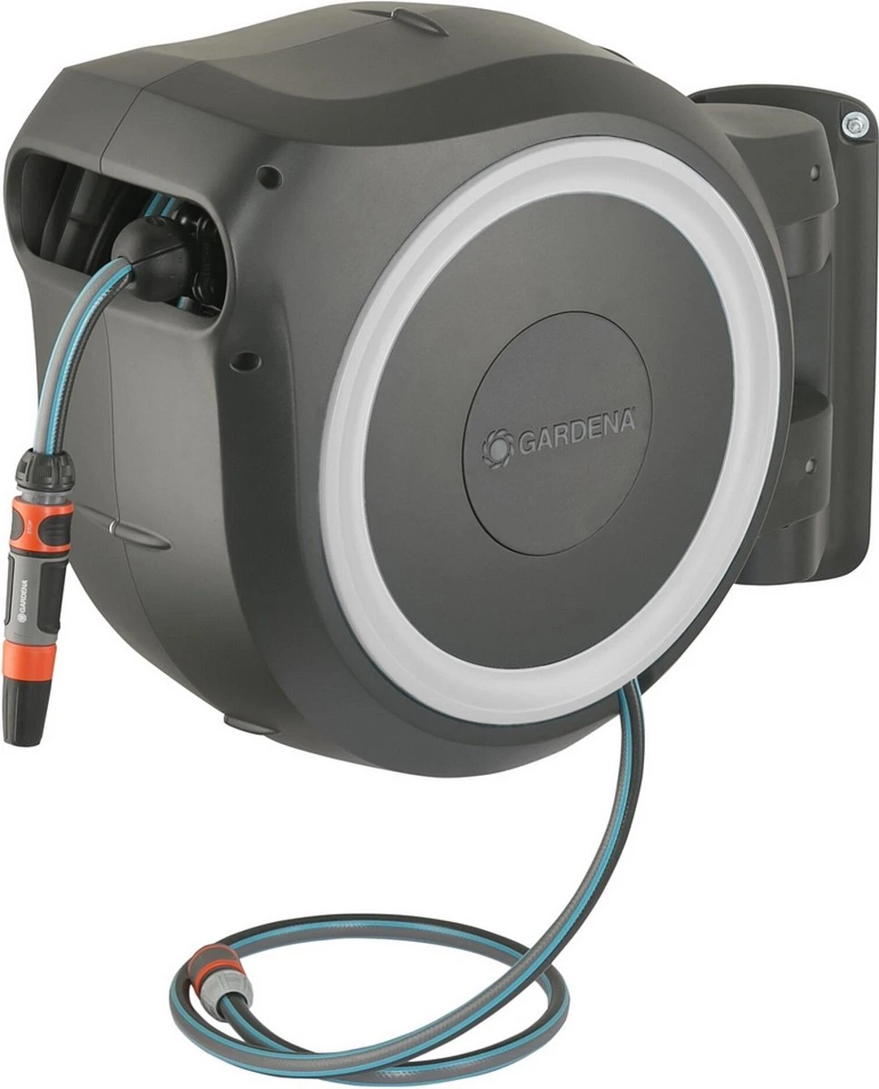 Met de wandslangenbox RollUp XL is het bewateren van een grote tuin aangenaam en eenvoudig. U bevestigt de compacte slangopslag permanent op de muur van uw huis en sluit deze met een aansluitslang aan op de kraan. Dankzij de 35 meter lange slang en de 180 graden draaibare slangenbox is het heerlijk om uw planten te bewateren en is dit geen corvee meer. De slangenhouder volgt uw bewegingsrichting en voorkomt dat de slang gaat knikken of in de war raakt. Nadat u de slang tot de gewenste lengte voor het bewateren hebt uitgetrokken, grijpen de zeer korte vergrendelingspunten zich automatisch vast en blokkeren ze de slang zodra u stopt. Door lichtjes aan het uiteinde van de slang te trekken, wordt het vergrendelmechanisme ontgrendeld en wikkelt een geïntegreerde stalen veer de verlengde tuinslang volledig automatisch, betrouwbaar en gelijkmatig voor u op. Dankzij de innovatieve RollControl-technologie gebeurt het oprollen veilig en gecontroleerd. De geïntegreerde slanggeleider zorgt ervoor dat de slang netjes en gelijkmatig wordt opgerold, zonder dat deze in de knoop raakt. De kraan- en slangaansluitingen van de slangenbox maken deel uit van het Original GARDENA System, zodat u op elk gewenst moment andere GARDENA opzetstukken kunt aansluiten. U hebt altijd uw GARDENA mondstukken bij de hand: ze kunnen onder de muurbeugel worden bevestigd en daar worden opgeborgen om ruimte te besparen. Het hoogwaardige materiaal is UV- en vorstbestendig en bestand tegen weersinvloeden. Daarom kan het systeem het hele jaar door worden gebruikt. Bovendien is de slangopslag beveiligd met een antidiefstalvoorziening. Alle benodigde aansluit- en montageonderdelen worden bijgeleverd in de wandslangenbox RollUp: een muurbeugel, een aansluitslang, alle benodigde Original GARDENA System onderdelen en een mondstuk met twee verschillende sproeiopties. GARDENA geeft vijf jaar garantie op de hoogwaardige slangopslag. Bewatering die altijd gebruiksklaar is , dankzij de GARDENA wandslangenbox RollUp XL.