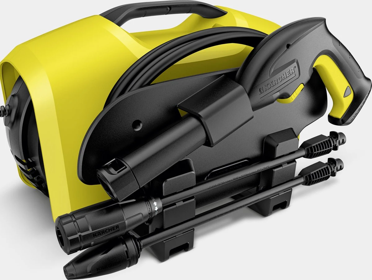 De slang, spuitlansen en spuitpistool kunnen netjes en compact worden opgeborgen.