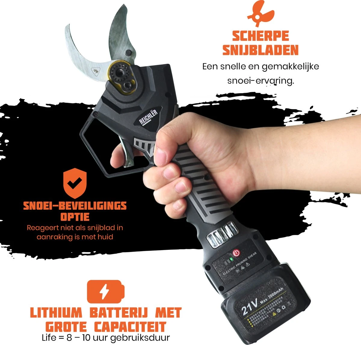 Wil je een elektrische snoeischaar waarmee je zowel dunne als dikke takken moeiteloos kan snoeien? Dan is deze slimme takkensnaar van Reichlër® een absolute must-have! De heggenschaar is speciaal ontworpen met snijbladen in de vorm van een papegaaienbek die gemaakt zijn kwalitatief hoogwaardig carbon, waardoor ze vlijmscherp zijn. Dit zorgt ervoor dat het uitermate geschikt is voor takken met een dikte tot wel 40 millimeter.