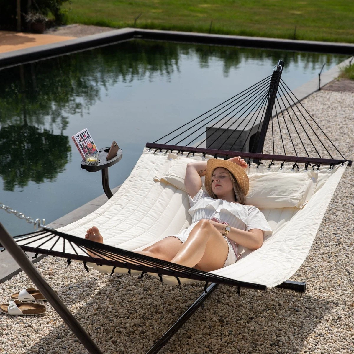 Een bekerhouder is geen optie, maar een noodzaak. Onze Vita5 hangmat met bekerhouder zorgt ervoor dat jij jouw drankje altijd binnen handbereik hebt. Jouw vrienden en familie komen langs om in je hangmat te ontspannen, en zij zullen verbaasd zijn over hoe handig de bekerhouder is.